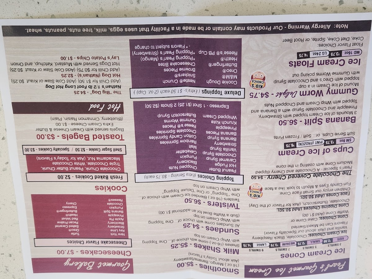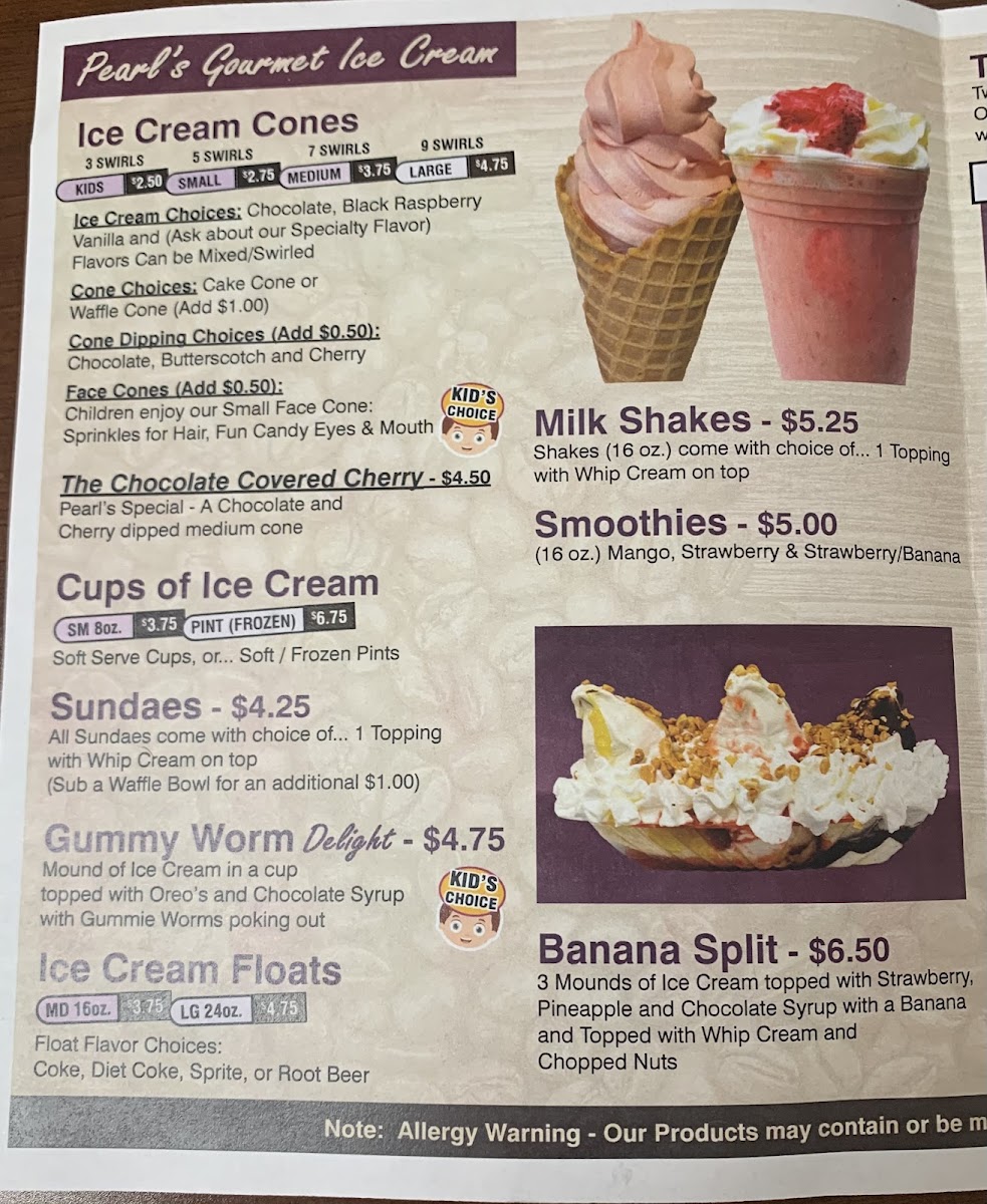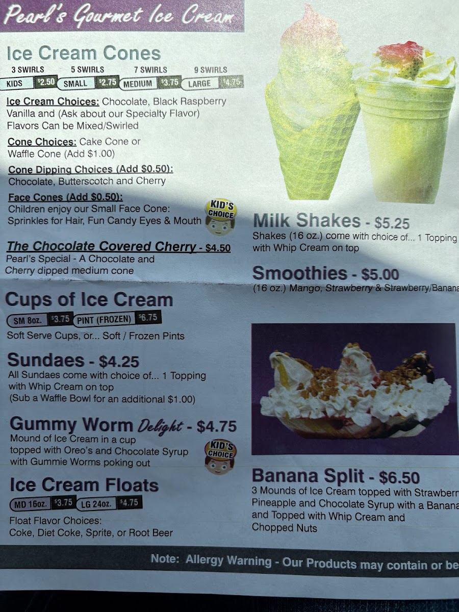 Ice cream lovers will find bliss at Pearl's too, with delightful cone options and exotic flavors of milkshakes or smoothies. The Gummy Worm Delight or a classic Banana Split would be perfect to cool down on a warm day, accompanied by a refreshing Sundae or Milk Shake.